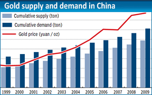 Gold consumption in China is likely to double over the next decade, boosting prices as burgeoning demand will outpace the growth in supplies, said a report released on Monday by the World Gold Council (WGC).