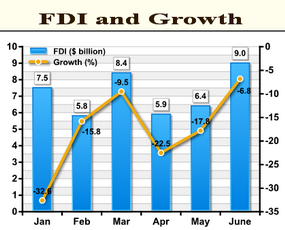 Foreign direct investment in China fell in June for the ninth straight month, but the decline narrowed, adding to signs of an economic recovery, the Ministry of Commerce said Wednesday.