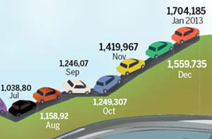 The number of registered private cars reached 53.08 million units by the end of 2012, up 22.8 percent from a year earlier.