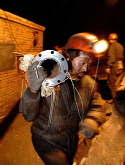 Rescuers install steel pipes to pump water out of the flooded shaft of a coal mine in order to rescue at least 57 trapped underground in Zuoyun county, Shanxi Province May 20, 2006. A total of 158 miners were working underground when the flooding accident took place on Thursday night, and 101 managed to escape, rescuers said. [Xinhua]
