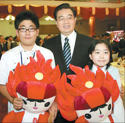 Chinese President Hu Jintao presents two Fuwa, the 2008 Olympic Games mascots, to Japanese students during a meeting with a Japanese youth delegation at the Great Hall of the People in Beijing June 19, 2007. [Wu Zhiyi] |