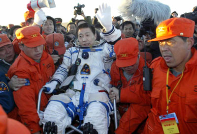 Yang Liwei, China's first space man, waves to the recovery teams after walking out of the return capsule of the Shenzhou V spaceship Thursday morning, October 16. [Xinhua/file]