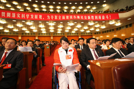 Delegates of the 17th National Congress of the Communist Party of China (CPC) listen as CPC general secretary Hu Jintao delivers a speech during the opening of the 17th CPC National Congress, in Beijing, October 15, 2007. [Xinhua]