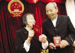 Pan Xiting, the groom and Chen Adi, the bride registered for marriage on Friday at the civil affairs bureau of the Lucheng District in Wenzhou City with the blessing of families and local government officials. "Now, we are a family and we will never separate from each other till death," said Pan. Zheng Guangliang, deputy director of the district's civil affairs bureau, confirmed that Pan and Chen are the oldest registered couple in Zhejiang. "The eldest couple to marry before were in their seventies," said Zheng. According to the Guinness Book of World Record, the oldest groom is Harry Stevens, an American. He was 103 when he married 84-year-old Thelma Lucas in Wisconsin in 1984. Pan's first wife passed away more than 20 year ago and Chen's ex-husband died of illness 11 years ago. The couple, both native of Yongjia County, got to know each other eight years ago and Chen has been taking care of Pan ever since. Pan denied that their romance began with love at the first sight, but said that his bride was taking good care of him and knowing him well. The pair decided to get married in April and their decision won support of the two families. "We were told that we needed to show our residence cards to get married, but Chen's has been lost for a long time," said Pan. Local civil affairs bureau made a concession to the couple after getting to know their story. "We believe that Madam Chen means more than a companion to Mr. Pan and we hope they will have a happy marriage life," said Zheng.