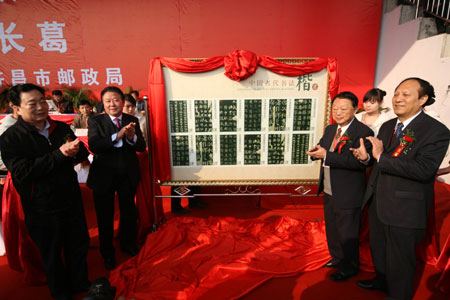 A ceremony is held to celebrate the launch of the first ever set of stamps made of traditional Chinese calligraphic paper in Changge, Central China's Henan Province on November 5, 2007. [newsphoto]
