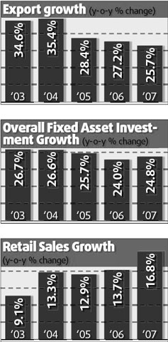 China's GDP was never that "coupled" with US growth, Bank of America economist Wang Tao said, because its exports have been diversified in destination and products. A Standard Charted Bank report says the US now accounts for only about 16 percent of China's exports, compared to 25 percent in 2001. Booming emerging markets, including Latin America and Africa, now buy about 37 percent of the steel, clothes and electronics it exports. Domestic manufacturers' rising competitiveness may help them expand in the global market, thanks to enhanced technological innovation and rising labor productivity. Machinery now comprises more than half of China's exports, compared to less than one-third in the early 1990s. "The slowdown in economic growth will reduce overall imports by the US but increase its demand for low-end and inexpensive goods," said Mei Xinyu, a researcher at the Chinese Academy of International Trade and Economic Cooperation, a think tank affiliated to the Ministry of Commerce. In fact, China's exports to the US are likely to increase, he said, citing the fact that they have increased steadily even though the US economy began slowing from late 2000. China's overall exports may slow down, but experts say strong domestic demand will continue to play a more important role in propelling the economy. "Strong domestic demand appears to have become a good cushion against slower external demand," said Gong Fangxiong, an economist with Morgan Chase Bank, Hong Kong. "And in 2008, we look to another year of solid economic growth at 10.5 percent. "A significant external slowdown would reduce the need for more aggressive tightening of China's macroeconomic policies, creating a healthier environment that would foster the needed shift toward more sustainable, domestically-driven growth." Last year, China's central bank raised the interest rate six times, and ordered local lenders to set aside more cash in deposit on 10 occasions to curb inflation and prevent overheating. The central government implemented a series of administrative measures, too, to cool down the economy. These steps have proved quite effective in reducing investment and production, with the GDP growth starting to decline from a record 11.9 percent in the second quarter of last year to 11.2 percent in the last. "The government (however) could tolerate slightly faster investment growth by relaxing its macro control slightly because of the US downturn," Citigroup China economist Shen Minggao said. Surging fiscal revenue will give the government great leeway to increase public spending when necessary, analysts said. And soaring corporate profits over the past years will give a strong incentive to domestic enterprises to build new plants and research facilities. According to the National Statistics Bureau, the government's fiscal revenue was 5 trillion yuan ($691 billion) last year, compared to 1.89 trillion yuan ($261 billion) in 2002. "The global downturn should help the Chinese economy to cool off without the government having to take aggressive tightening measures by resorting to blunt policy instruments," said Huang Qing, of Morgan Stanley. Besides, domestic consumption, which the government has tried to boost, is expected to remain robust after the country's retail sales growth hit an eight-year high last year. "At the same time, domestic market-oriented sectors, especially those exposed to capture spending supported by the government, should do relatively well as the government raises its spending to shore up domestic demand, offsetting external demand," Huang said. Rising consumer prices, however, will remain a big concern for the government because food and oil prices, the main drivers of inflation, are not expected to ease this year, analysts said. Achievements of past five years Stable and brisk growth. The annual GDP growth averaged 10.6 percent, with fluctuation of less than 1 percentage point. Record number of jobs created. The country created 51 million employment opportunities. Rising economic benefits. The country's fiscal revenue climbed to 5 trillion yuan ($691 billion) last year, compared with 1.89 trillion yuan ($261 billion) in 2002. Large-scale firms' accumulated total profit over the past five years rose to 7.86 trillion yuan ($1.09 trillion). Last year alone it was 2.2-trillion-yuan ($304 billion). Rapid income growth of urban and rural residents. The disposable income of urban residents grew at an annual average of 9.8 percent to reach 13,786 yuan ($1,900) last year. Rural residents' net income rose, too, to 4,140 yuan ($572) in 2007, increasing 6.8 percent a year. Notable progress in overall national strength. The total installed electricity generating capacity increased 350 million kW, and 28,000 km of highways were built.