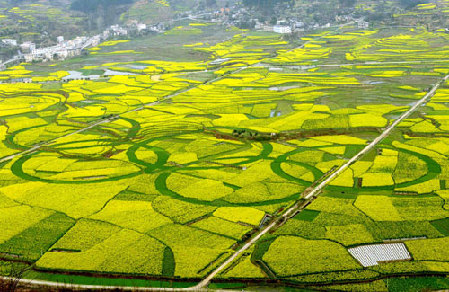 Wheat crops are planted in circles to create the five Olympic rings in Kaiyang County in Southwest China's Guizhou Province. Each ring is 136m in diameter and 9m wide.