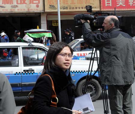 An overseas journalist shoots video clips in Lhasa, capital of Southwest China's Tibet Autonomous Region, March 27, 2008. [Xinhua]