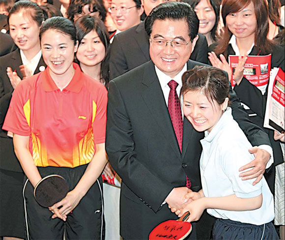 President Hu Jintao hugs Japanese table tennis player Ai Fukuhara yesterday after taking part in a game with the star paddler and world champion Chinese player Wang Nan (left) at Waseda University in Tokyo. AFP