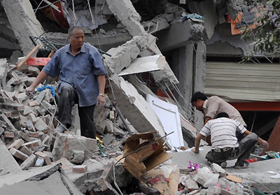 Rescue workers search for victims in debris in Dujiangyan, Southwest China's Sichuan Province on May 12, 2008. An earthquake measuring 7.8 on the Richter scale jolted nearby Wenchuan County at 14:28 Monday. [Xinhua]