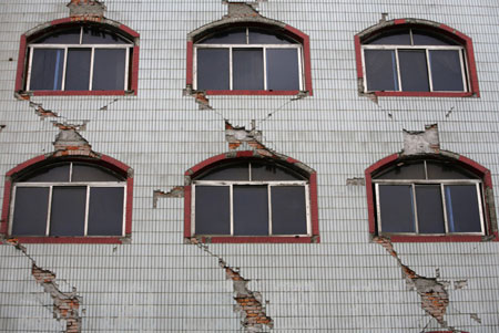 Cracks are seen on a building in the township of Hanwang in Mianzhu city, northeast of Chengdu, Sichuan Province May 14, 2008. China poured more troops into the earthquake-ravaged province of Sichuan on Wednesday to speed up the search for survivors. [Agencies]