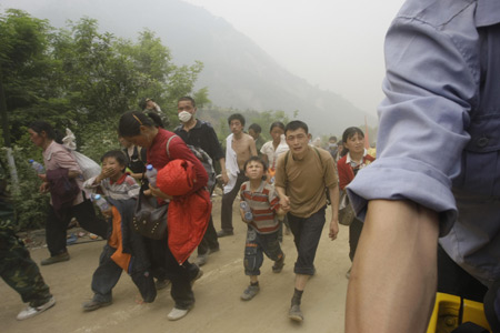 Residents and rescue workers evacuate towards higher ground from the centre of earthquake-hit Beichuan county, Sichuan province, May 17, 2008. Beichuan county near the epicentre of a 7.8-magnitude earthquake was ordered to evacuate immediately Saturday from areas around a lake that is rising rapidly and may burst at any time.. [Agencies] |