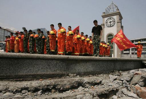 Rescuers pay tribute to those who died in a massive earthquake, in front of a clock which stopped at the time the earthquake hit, in the township of Hanwang in Mianzhu city, north of Chengdu in Sichuan Province May 19, 2008. A nation-wide ceremony was held on 14:28 on Monday, exactly one week after a massive earthquake hit Sichuan. [Agencies]