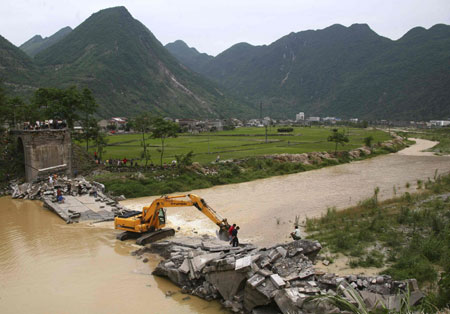 The ruins of a collapsed bridge are cleared to make way for the water from a "quake lake" in the earthquake-devastated city of Beichuan, Sichuan province June 10, 2008. [Agencies]