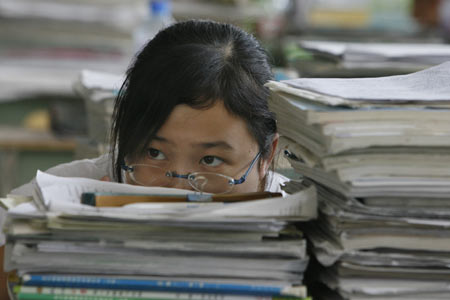 A middle school student reviews for his college entrance examination at a temporary classroom in the earthquake-hit Anxian county, Sichuan province June 28, 2008. [Agencies]