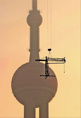 A crane carries materials in front of the Oriental Pearl Tower in Shanghai's Lujiazui. [Bloomberg]