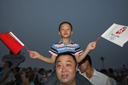 Updated: 2008-08-08 12:02 A Chinese boy waves the country's flag (L) while singing the national anthem during a flag hoisting ceremony at Tiananmen Square on the inaugural day of the 2008 Beijing Olympic Games on August 08, 2008. Thousands of people flock into Tiananmen Square, Beijing, to cheer for the Games on the day it opens. [Agencies] |