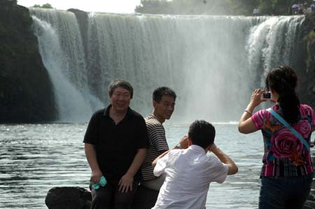 Tourists take photos at the Mudanjiang Global Geopark in Mudanjiang, northeast China's Heilongjiang Province, August 30, 2008. [Xinhua]