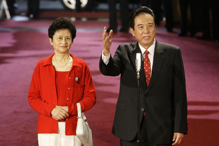 Chen Yunlin (R), president of the mainland's Association for Relations Across the Taiwan Straits, gestures while speaking during the farewell ceremony at the Grand Hotel in Taipei November 7, 2008. Chen's wife Nai Xiaohua stands on the left. [Agencies]