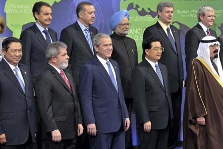 US President George W. Bush (C) poses among other world leaders during a group photo at the G20 Summit on Financial Markets and the World Economy at the National Building Museum in Washington, November 15, 2008. [Agencies]