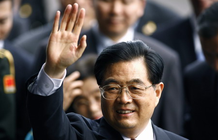 Chinese President Hu Jintao waves to journalists upon arrival at Juan Santamaria airport in Alajuela November 16, 2008. Hu is on a two-day official visit to Costa Rica. [Agencies]