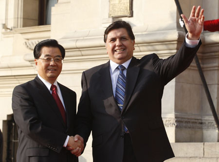 Chinese President Hu Jintao (L) and Peru's President Alan Garcia shake hands at the government palace in Lima, November 19, 2008. Hu Jintao was in Peru to attend the Asia-Pacific Cooperation (APEC) summit. [Agencies]