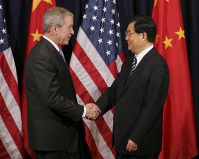 US President George W. Bush and President Hu Jintao of China shake hands before their meeting at the APEC Summit in Lima, Peru, Friday, Nov. 21, 2008. [Agencies]