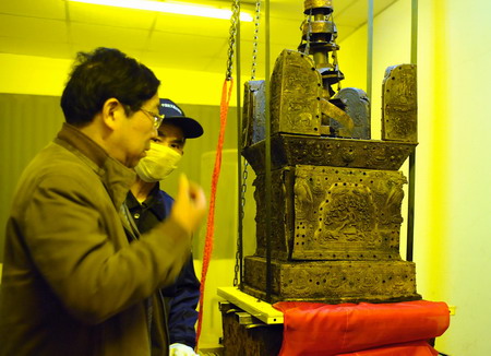 An archeologist talks with a worker about ways to remove and protect the miniature pagoda, which is believed to contain a part of Buddha's body in Nanjing, Jiangsu province November 22, 2008. [Xinhua]