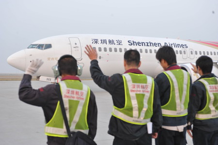 Ground crew members wave to passengers onboard the Shenzhen Airlines plane which is the first cross-Straits flight of the day from the Chinese mainland to Taiwan at the Shenzhen International Airport in Shenzhen, south China's Guangdong province December 15, 2008. [Xinhua]