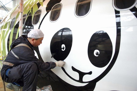 A worker paints on an Air China passenger plane in Chengdu, Southwest China's Sichuan province, December 25, 2008. Two Airbus A321 planes, named "Beautiful Sichuan", will serve the newly opened Chengdu-Taipei air route. [Xinhua]