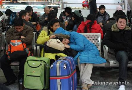 Travelers wait for trains at Beijing West Railway Station on Thursday, January 1, 2009. Millions of people started setting home on long journeys on Friday from Beijing as the city kicked off its Spring Festival travel season early. [Asianewsphoto]
