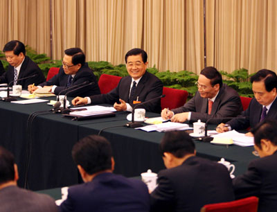 Chinese President Hu Jintao (3rd R) meets with deputies to the First Session of the 11th National People's Congress (NPC) from east China's Shandong Province in Beijing, capital of China, March 9, 2008. Hu Jintao joined in the panel discussion of Shandong delegation on Sunday during the First Session of the 11th NPC. [Xinhua]