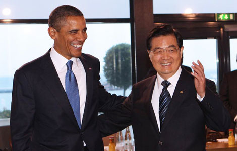 Chinese President Hu Jintao met with US President Barack Obama on Nov 3 in Cannes, France.