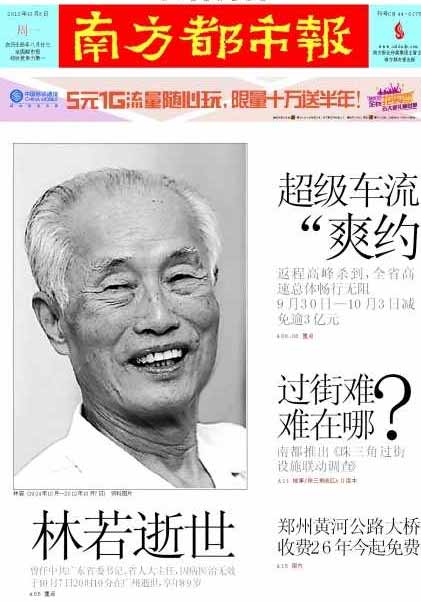 Former Party chief of Guangdong province Lin Ruo passed away at the age of 89, Southern Metropolis Daily reports. Lin Ruo was known for driving forward the reform and opening up policy in Zhanjiang, Guangdong province as early as in 1977.