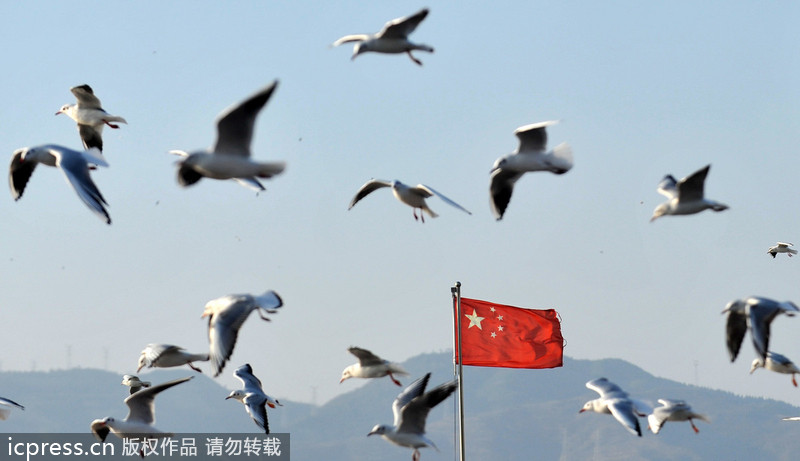 Black-headed gulls fly over Dianchi Lake in Kunming city, Southwest China's Yunnan province, on Dec 22, 2013. [Photo/icpress.cn]