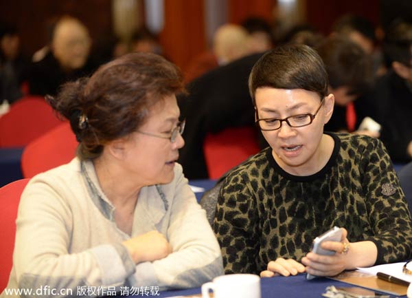 Chinese comedian Song Dandan chats with actress Song Chunli about something on her cell phone during the ongoing two sessions on March 7. [Photo/icpress.cn] |