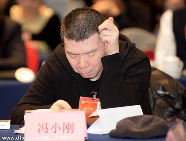Chinese film director Feng Xiaogang watches his cell phone on March 7 while attending a panel discussion during the ongoing two sessions. [Photo/icpress.cn]