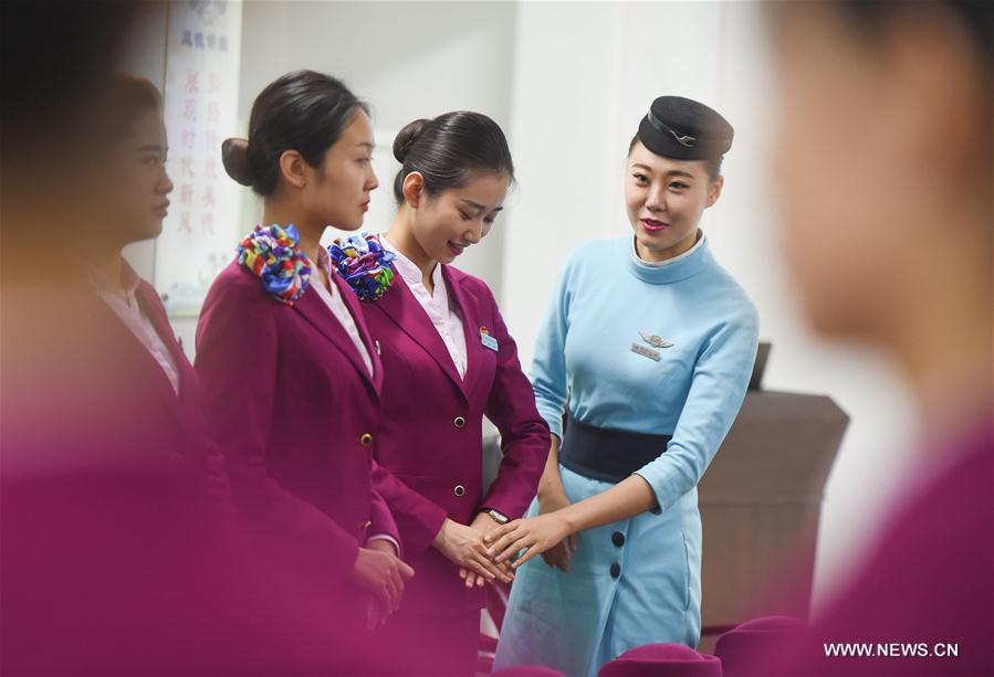 A flight attendant (1st R) and high-speed train attendants attend a training session in Xiamen, Southeast China's Fujian province, Dec 1, 2016. Attendants from Xianmen Airlines and Nanchang Railroad Bureau attended a training session for the upcoming Spring Festival travel rush. [Photo/Xinhua] |