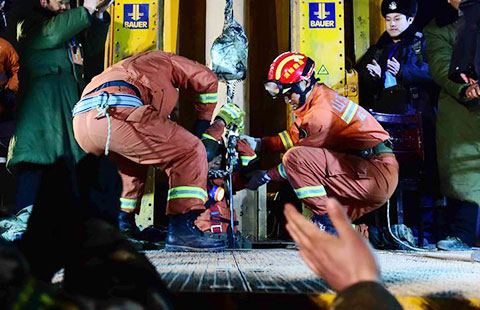 One of the four surviving miners is lifted out after being trapped in a collapsed mine 36 days in Pingyi, East China's Shandong province, on Jan 29, 2016.