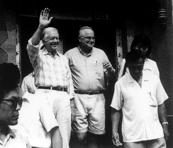 Former US president Jimmy Carter (left) and US academic Michel Oksenberg (center) visit Zouping in 1997.[Photo/China Daily] |