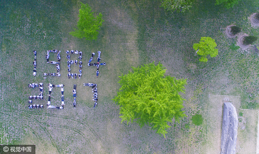 Students for photos in Liaocheng University in Liaocheng, East China's Shandong province, on April 15, 2017. [Photo/VCG]