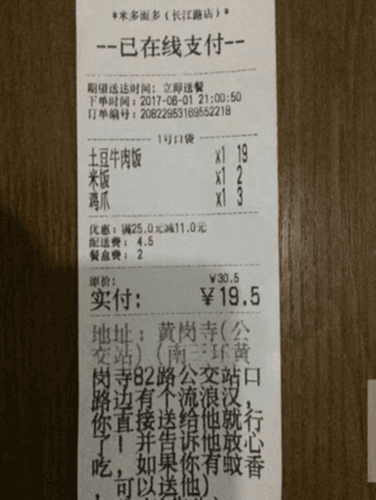 He said the order, made on June 1, was placed for?food including a?serving of beef and potato-topped rice, and added the recipient was to be a "vagrant near the bus stop of route 82 at Huanggangsi in 3rd Ring Road" as detailed in the order's note.
