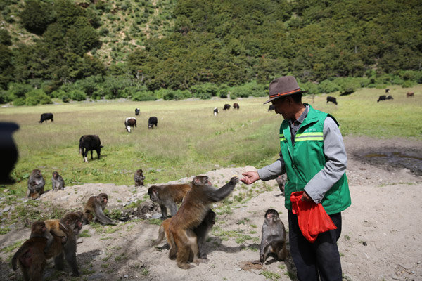 The local government offers the monkeys highland barley as a staple food, but Tobgyal also often spends his own money to provide extra meals. He knows that the monkeys like apples, so he spends at least 100 yuan ($15) a month buying the fruit when it is available in the local market.