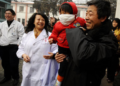 A two-year-old girl surnamed Peng (2nd R) leaves hospital after recovering from bird flu at the Taiyuan No. 4 Hospital in the capital of Shanxi province, Feb. 3, 2009.