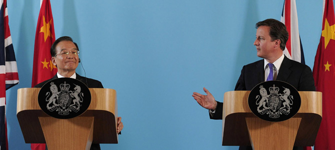 Visiting Chinese Premier Wen Jiabao met in London Monday with his British counterpart David Cameron on further promoting bilateral ties and cooperation.