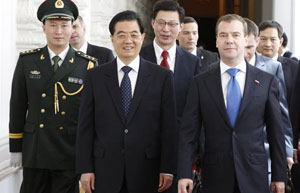 Visiting Chinese President Hu Jintao and his Russian counterpart Dmitry Medvedev met here Thursday on deepening the China-Russia strategic partnership of cooperation.
