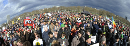 Demonstrators gather at a rally in Hyde Park in central London March 28, 2009. Thousands of people marched in Britain, France and Germany on Saturday to protest about the global economic crisis and urge world leaders to act on poverty, jobs and climate change at a G20 summit next week. [Agencies]