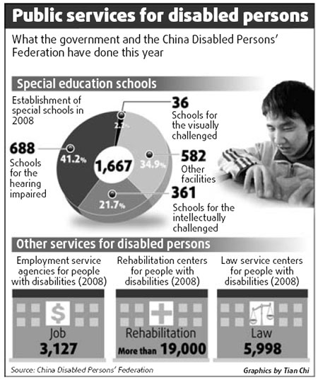 According to a report presented by Deng, the country has over 19,000 rehabilitation centers, 1,655 special education schools, 3,127 employment agencies and 5,998 law service centers for the physically challenged.