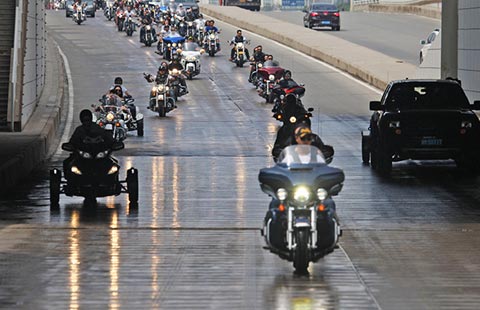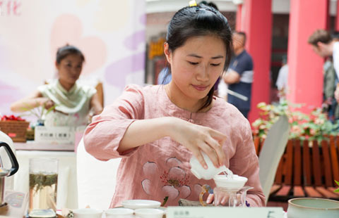 A model displays gold jewelry weighing a total of 3.5 kg at a trade show in Fuzhou, Fujian province,June 19, 2014. The model weighed down by the heavy ornaments, sits as she is photographed by visitors. [Photo provided to China Daily] |