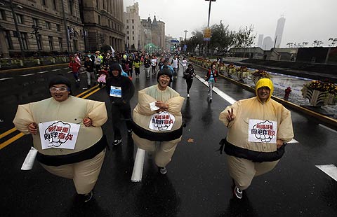 Participants wear costumes while competing in the Shanghai International Marathon on November 2, 2014.